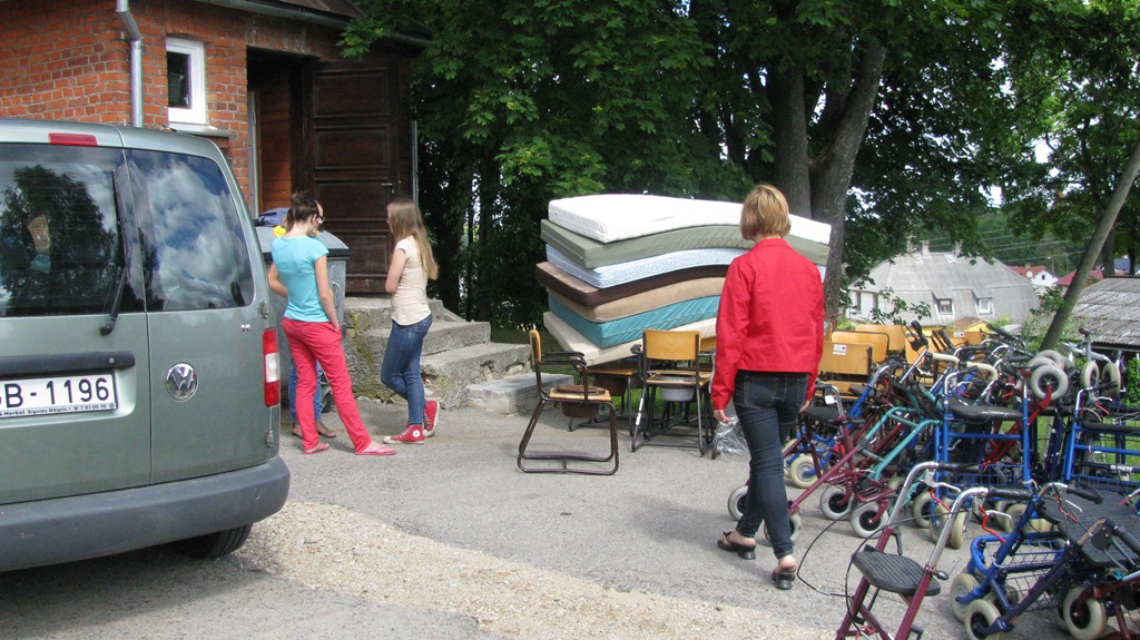 Begin juli is er een truck vanuit Nederland gekomen. Wat geweldig om te zien wat er allemaal mee is gekomen: postoelen, rollators, matrassen, kleding en schoenen, speelgoed en nog veel meer. Er waren zo’n 20 mensen om te helpen lossen en binnen twee uur was de truck leeg en alles opgeslagen. Wat is er hard gewerkt, zowel in Nederland qua inzameling als hier met het lossen. Dit was voor mij droom die is uitgekomen, een truck vol met goederen voor de mensen in Smiltene. Ik hoop dan ook dat het niet eenmalig is! Inmiddels zijn alle hulpgoederen naar het pensionaat/revalidatiecentrum in Smiltene gegaan. De directrice en social worker waren diep onder indruk: “we worden dus niet vergeten” waren hun woorden. In Letland moeten alle kleine ziekenhuizen sluiten en sinds kort is er een pensionaat in het oude ziekenhuis. De hulpgoederen kwamen op het juiste moment want er is geen geen ondersteuning genoeg vanuit de regering om alles aan te kunnen schaffen. Er is met name een groot tekort aan incontinentiemateriaal en beddengoed en gelukkig konden we ze hier ook blij mee maken. De directrice heeft ons een rondleiding gegeven en ik ben geraakt om te zien hoe de mensen veelal in bed hun dagen doorbrengen. In Nederland is dat niet anders, maar daar zijn de faciliteiten wel beduidend beter. De social worker is erg begaan met de mensen, dit was mooi om te zien! Daarnaast gaat een van de bedden en matrassen naar een jonge man die we tijdens de voedselpakkettenactie hebben ontmoet, zijn moeder was in tranen toen ze hoorde dat het bed er aan komt! Het speelgoed dat was meegekomen is voornamelijk uitgedeeld onder de mensen tijdens de kledingdag. Ook is er speelgoed overhandigd aan de psychologe van het familycenter, zal er speelgoed gaan naar de kindergarden en tot slot zal er nog iets bij Sarkani afgeleverd worden.